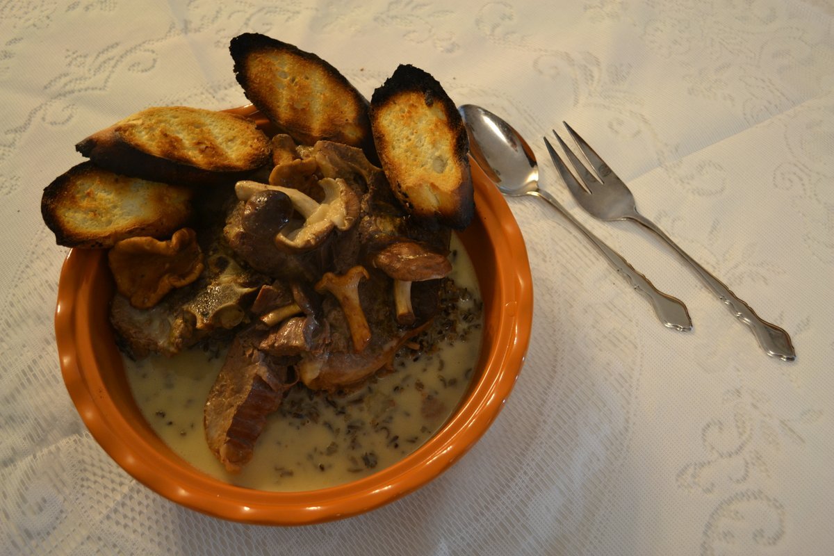 Paruoštą padažą užpilkite ant bizonų mėsos. Patiekite su skrebučiais, laukiniais grybais ir ryžiais.