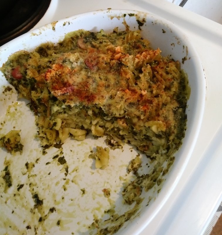 Kai makaronai išvirs, nupilkite vandenį ir sudėkite į paruoštą kepimo indą. Užpilkite padažą ant makaronų ir viską gerai išmaišykite.