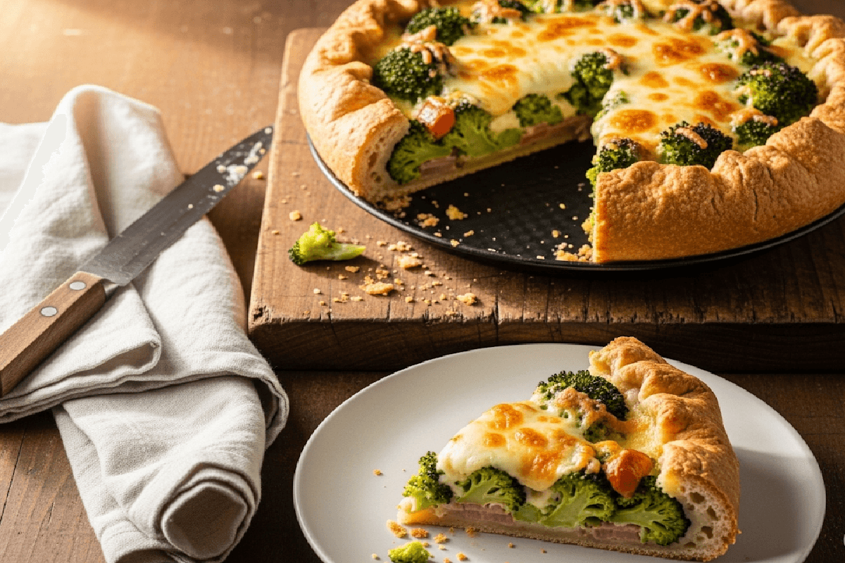 Traškus ir trapus olandiškas pyragas su brokoliais, kumpiu bei aromatingu sūriu. Puikiai tinka tiek vasaros iškyloms, tiek šiltiems šeimos pietums!