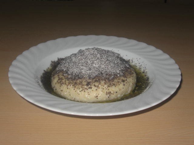 Germknödel patiekti galima su vaniliniu kremu arba ištirpintu sviestu.