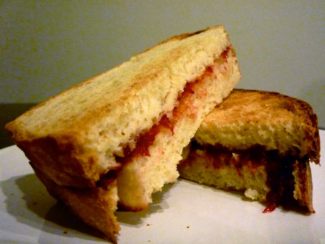 Paprasčiausi sumuštiniai su uogiene. Tereikia dviejų duonos riekelių ir mėgstamos uogienės. Greitas ir skanus užkandis.